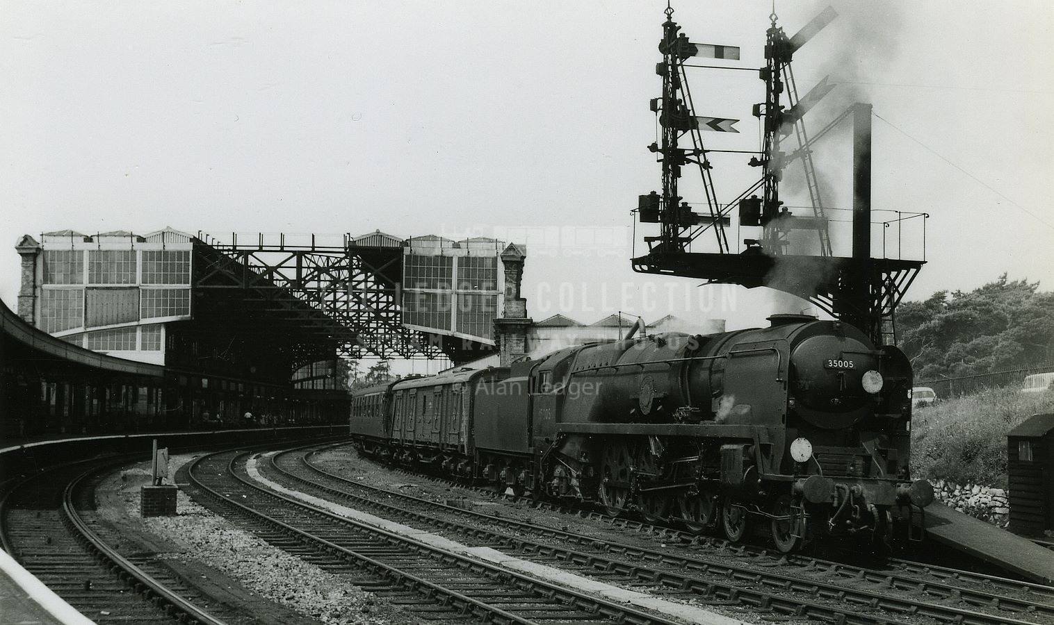 A great black and white shot of Merchant Navy 4-6-2 35005 “Canadian Pacific” with that fantastic signal gantry at the platform end, and the road is clear for it to leave Bournemouth Central with an up express for Waterloo.