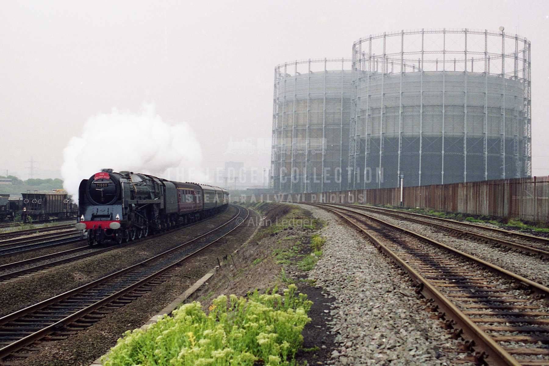 Here’s a shot for all you Brumies, (The Duke) 71000 ”Duke of Gloucester” Standard class 8P 4-6-2 working a London to Derby special passing by those magnificent gas ometers at Washwood Heath that supplied us all before the advent of natural gas.